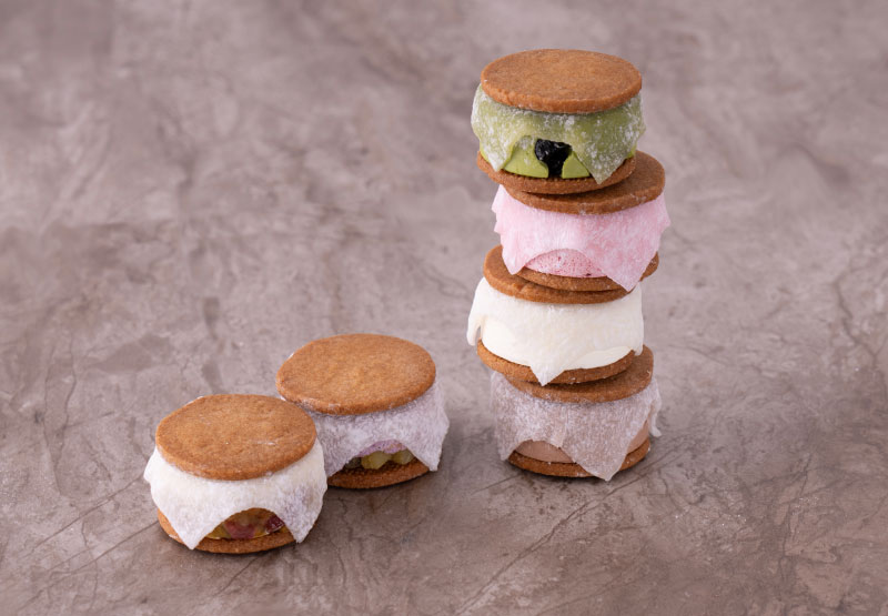 自家製クッキーに、しっとりとなめらかなバタークリーム、そして通常のバターサンドでは珍しいもちもち食感の「求肥」を組み合わせました。